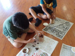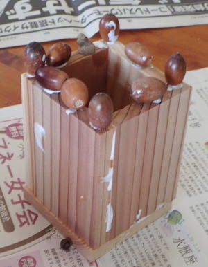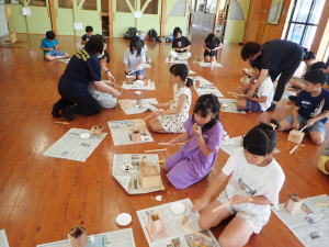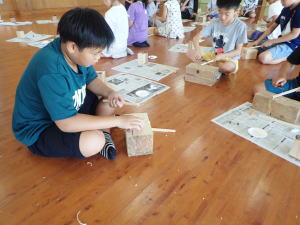 体験を通じて、楽しみながら木に携わること(木に関する仕事、森林環境等)について関心を持ってもらおうと、間伐材を使ってペン立てやマイ箸を作りました。