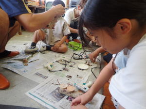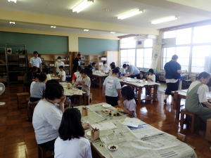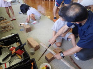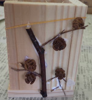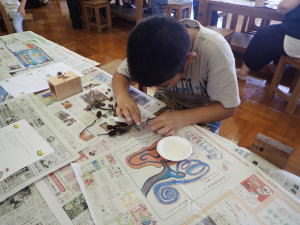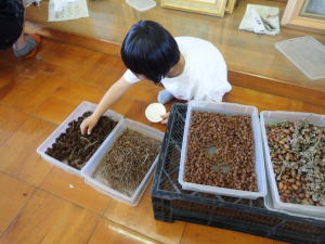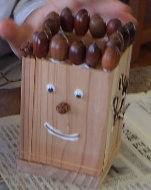 工作を通して、自然に親しむ体験をしようと、自然素材を使ったペン立てやキ-ホルダ-を作りました。