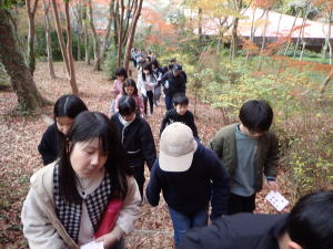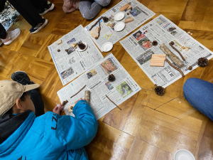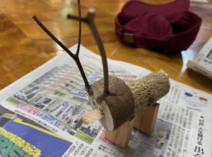 森林や自然に親しもうと、間伐材や木の実を使って昆虫や動物を作り、森の中を散策しました。