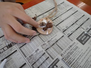 キ-ホルダ-の材料は自然素材の木の実や木の輪切りです♪