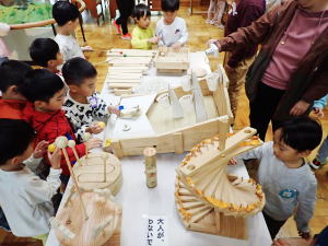 ![]() スタッフ手作りの木のおもちゃ!感触を楽しみながらみんなで遊びました。 |