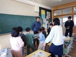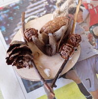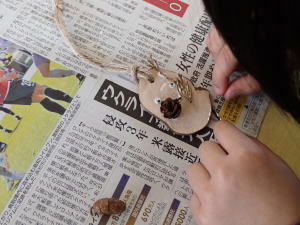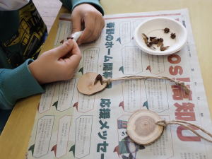 木の実などの自然物を通して、山や森、自然に興味を持ち、自然のものを活かしたものを作ろうと、木の実などを使ったキ-ホルダ-を作りました。